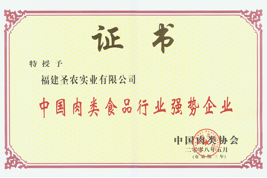 2008年肉類(lèi)食品行業(yè)強(qiáng)勢(shì)企業(yè)證書(shū)