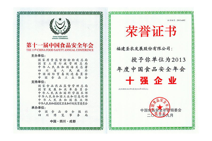 2013年度中國(guó)食品安全年會(huì)十強(qiáng)企業(yè)