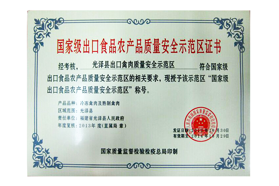 2012年國(guó)家級(jí)出口食品農(nóng)產(chǎn)品質(zhì)量安全示范區(qū)證書(shū)