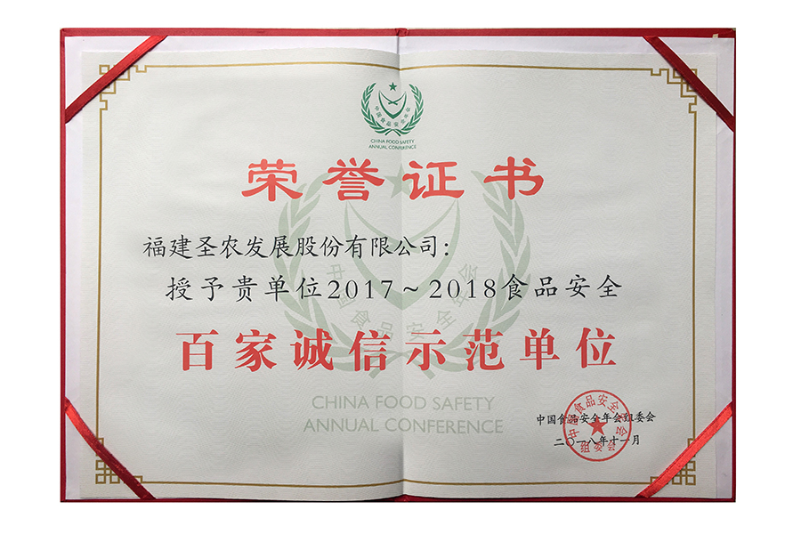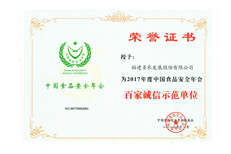 2017年中國(guó)食品安全年會(huì) 百家誠(chéng)信示范單位.證書(shū)