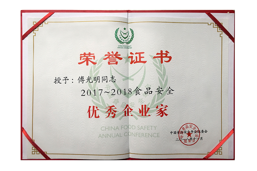 2018食安優(yōu)秀企業(yè)家證書(shū)