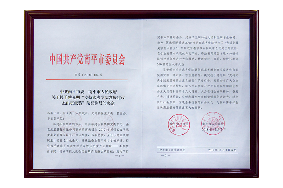 2018年中國(guó)南平市委下發(fā)通稿(支持武夷學(xué)院發(fā)展建設(shè)杰出貢獻(xiàn)獎(jiǎng))
