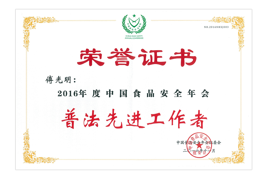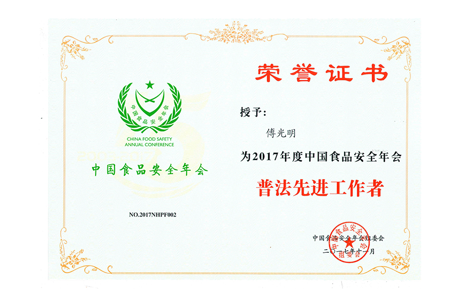 2017年(傅光明)中國(guó)食品安全年會(huì).普法先進(jìn)工作者.北京.證書(shū)