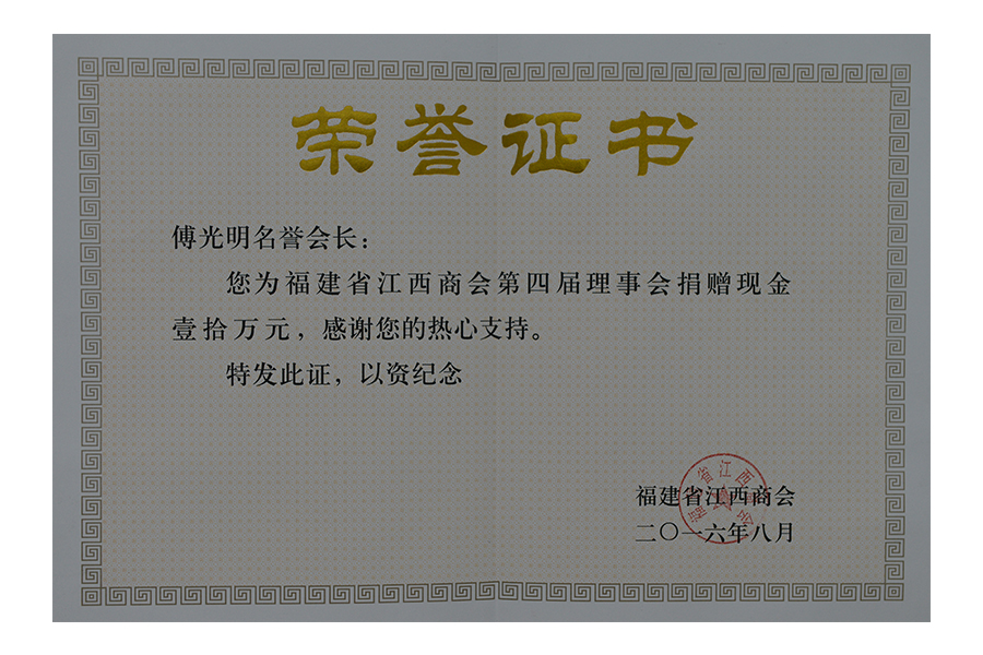 2016年(傅光明)江西商會(huì)捐贈(zèng)10萬(wàn)元證書(shū)