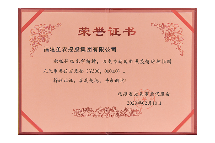 2020年支持新冠疫情防控捐贈(zèng)三十萬(wàn)榮譽(yù)證書(shū)