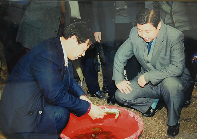 (1999年3月15日,習(xí)近平同志第二次到圣農(nóng)調(diào)研,當(dāng)時(shí)圣農(nóng)除養(yǎng)雞外,還養(yǎng)有部分甲魚。)
