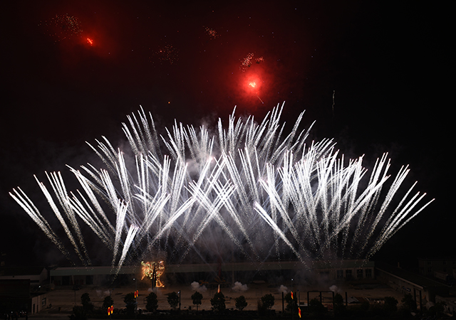 整場焰火晚會分“圣農盛世”、“ 騰飛圣農”、“ 冠軍風采”、“ 祝福圣農”四個樂章。有別于往年,今年舉辦的是音樂焰火晚會,焰火燃放節(jié)奏與音樂旋律、意境有機融合,鍛造出一種火與音樂、光與節(jié)奏的完美效果。晚會采用3D立柱焰火、無人機焰火,9架無人機呼嘯而過、騰空躍起,安裝在無人機上的冷光煙花璀璨綻放,伴隨著無人機的移動、搖擺,在夜空中跳起炫酷的焰火舞。而30多米高的3D立柱上,伴隨著動感的音樂,焰火按旋律燃放,時而左右齊發(fā),時而旋轉噴射,將晚會推向又一個高潮。