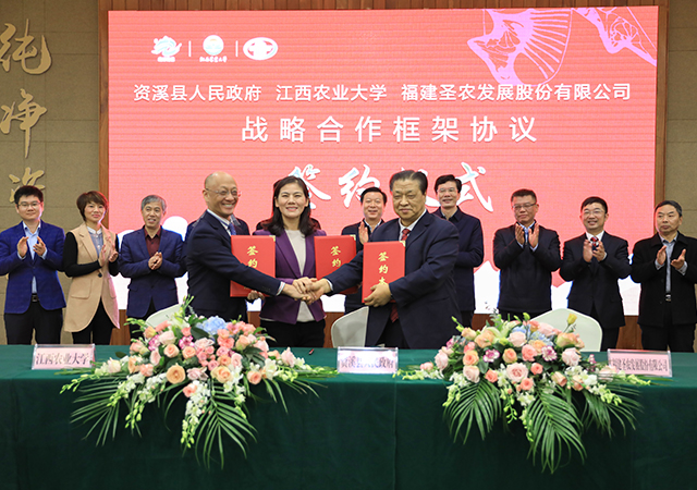 隨后,資溪縣政府、江西農(nóng)業(yè)大學(xué)、圣農(nóng)集團(tuán)在資溪縣大覺山國際酒店簽訂戰(zhàn)略合作框架協(xié)議,三方將合力在資溪縣打造出圣農(nóng)集團(tuán)第二個白羽肉雞育種基地。