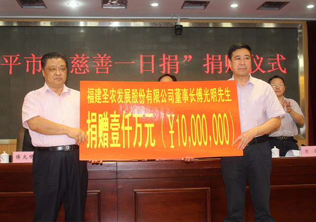2015年8月11日,在南平市舉行的“慈善一日捐”捐贈儀式上,南平市慈善總會會長、圣農(nóng)發(fā)展股份有限公司董事長傅光明再次以個人名義捐贈1000萬元。他承諾,將以每年1000萬元的額度,向該會連續(xù)捐贈20年。他是這么說的,也是這么做的,迄今為止,已連續(xù)八年向市慈善總會捐款8000萬元。